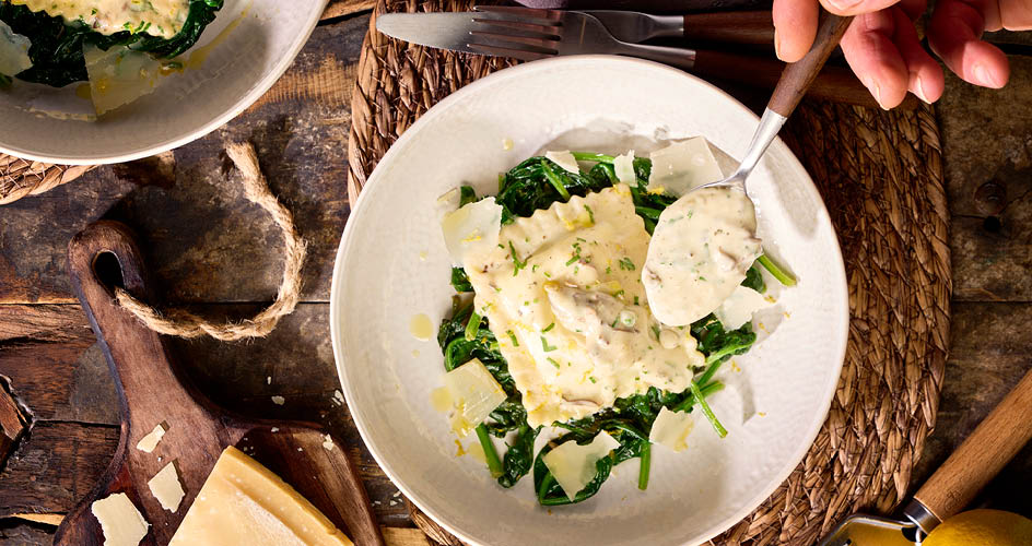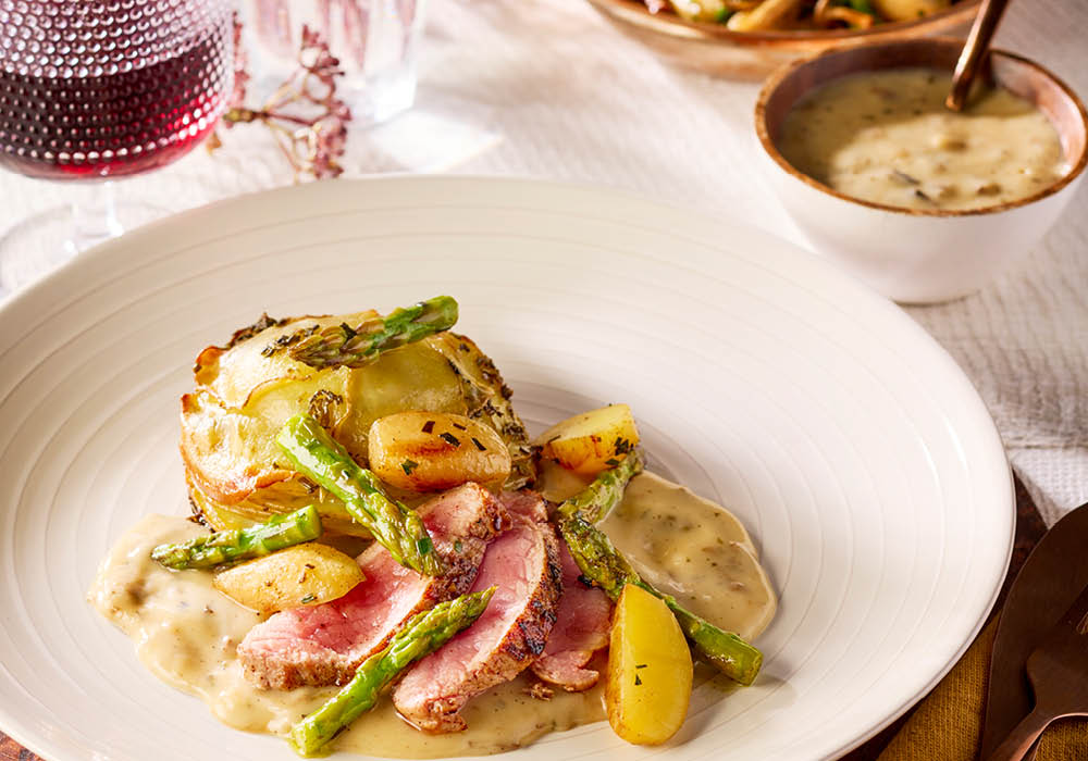 Geserveerd Hela Maaltijdsaus Champignon als smaakmaker.